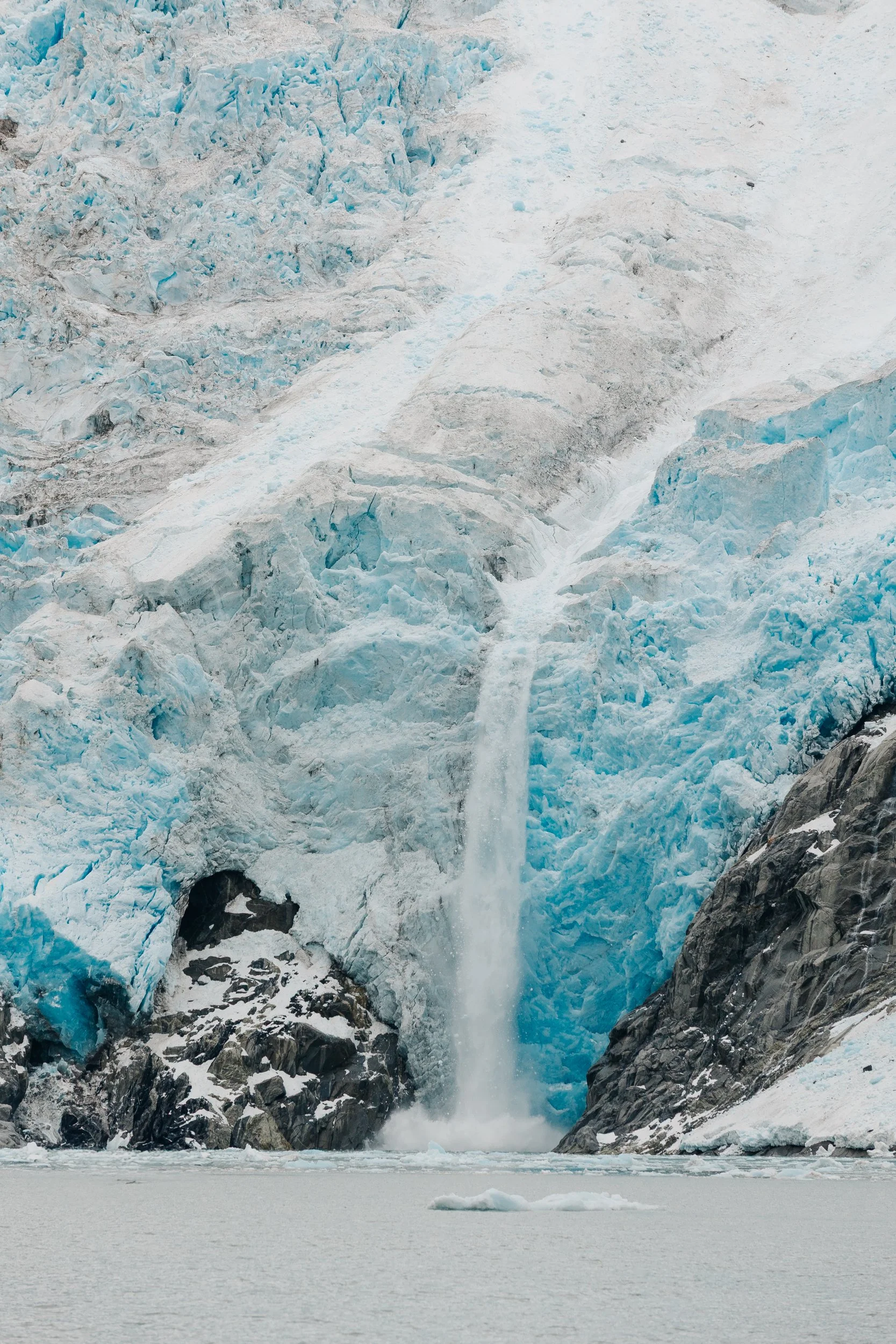 We ventured into Northwestern Fjord—a contrasting experience to Aialik Arm. Multiple glaciers descended like frozen rivers from the mountains: Sunlight, Southwestern, Anchor, and Ogive to the west; Northwestern and Redstone to the east. Passing Striation Island, we observed iron-rich red rocks forming a striking backdrop for a family of orcas swimming gracefully up the fjord. Approaching Ogive Glacier, its gray visage resembled stone, while Northwestern Glacier’s cascading icefalls and exposed rock evoked the image of an ancient, bearded man.