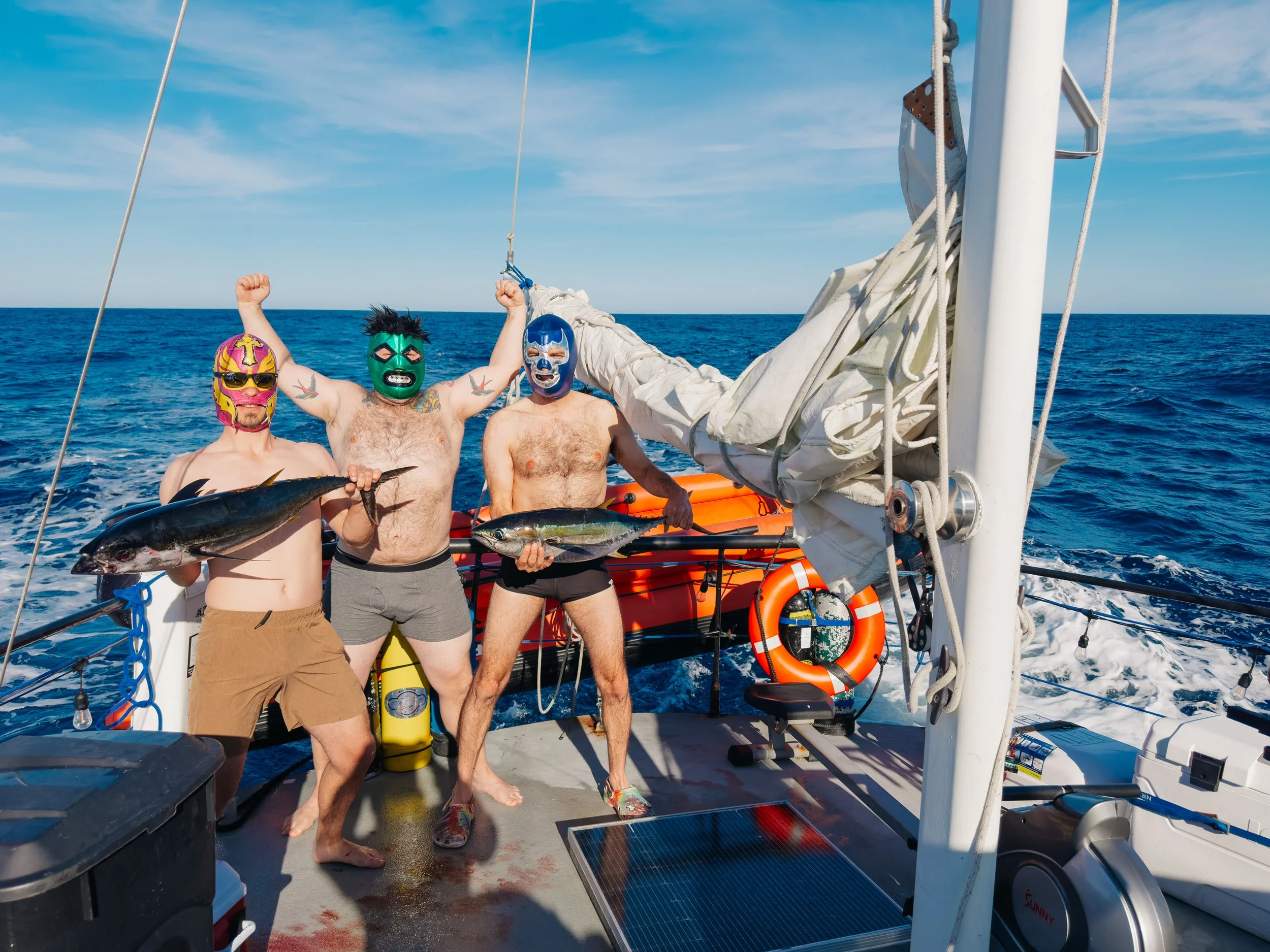 Life aboard settled into a pattern dictated by wind and time. For nearly two weeks, we sailed primarily at night, carried south by steady trade winds. Mornings brought anchorage at quiet coves and small villages, where we would sleep late, gather slowly, and then head ashore to explore. By sunset, we would lift the anchor once more and continue on. The days became pockets of stillness between passages; the nights, our true movement.At Bahía Asunción, we stopped at a nearby island and slipped into the water with sea lions. Their sleek bodies darted and spun around us – curious, playful, entirely at ease – as we briefly entered their underwater world. Later, we took the dinghy ashore to the mainland and wandered into town in search of tacos, an endeavor that had quietly become one of my greatest anticipations for our months in Mexico.That evening, back on the boat as we prepared to depart, the hills of Isla Asunción came alive. Hundreds upon hundreds of cormorants gathered along the ridgelines, their silhouettes dark against the fading light… a kind of avian choreography marking the close of day.The next morning, the sea provided again. Both fishing lines struck in quick succession, and the calm of early light shattered into urgency. Louie called out, “fish on!”, and within moments the deck was filled as the three men aboard were half-dressed, hauling in twin tuna with a mix of skill and brute determination. Before the work of fileting the fish began, they paused to don colorful luchador masks and snap a photo in their boxers. It was absurd and perfect, the kind of moment that lives somewhere between necessity and joy.At Laguna San Ignacio near Punta Abrejeos, the coastline opened into something altogether different. We anchored outside and rode the dinghy in, skimming across the surface like a long, unbroken wave. Inside, the lagoon stretched vast and luminous. Located within the El Vizcaíno Biosphere Reserve, this UNESCO World Heritage Site is one of the last undeveloped whale nurseries on Earth, a sanctuary where gray whales return each winter to birth and nurture their calves. In just weeks, these waters would be filled with them, completing one of the longest migrations of any mammal on the planet, nearly 10,000–12,000 miles round trip from the Arctic. And although we like to think we are traveling south of our own accord, long before charts, long before us, this route already existed… drawn not on maps, but in instinct of the natural world.The landscape felt almost surreal. Sand dunes rose in soft, wind-carved lines, backed by distant blue mountains, a scene that echoed the contours of the sand dunes found throughout the Mojave Desert. Dolphins moved through the channels as we explored deeper, slipping in and out of view. Mangroves formed a labyrinth of narrow waterways, green and winding like veins through the land. Onshore, the beach was scattered with shells and whale bones, a quiet reminder of the life cycles that define this place.Further south, we stopped at Bahía Santa María before entering Magdalena Bay, where a small fishing camp and surf camp marked our landing, and from there we hiked to a vantage point overlooking the bay. For Louie and his friend, this place held memory: they had passed through here fifteen years before on Louie’s previous journey down the Baja coast. Watching them stand there, recalling fragments of a younger version of themselves, it felt as though time had folded in on itself.Upon entering Magdalena Bay, it became immediately clear that this was not a place you simply pass through. The bay unfolded in layers, with many channels, mangroves, hidden anchorages, with each turn revealing another quiet pocket of water and land. It felt like a place that required time, patience, and curiosity to truly know. A week, even longer, could be spent here tracing its edges and still leaving with more undiscovered than seen.We anchored in Puerto Magdalena and went ashore in search of lobster tacos at Restaurant MiraMar. But beneath the stillness of the bay lies a heavier past. In the 1800s, both Laguna San Ignacio and Magdalena Bay were global whaling hubs, with American, French, Russian, and Dutch ships anchoring here. In these same waters – now calm, protective, filled with life – there were once ships and smoke, the nursery grounds of gray whales turned into hunting grounds. It is difficult to reconcile the quiet of today with the violence that once unfolded here.Entering the Sea of Cortez: From Ocean Swell to Inland Sea