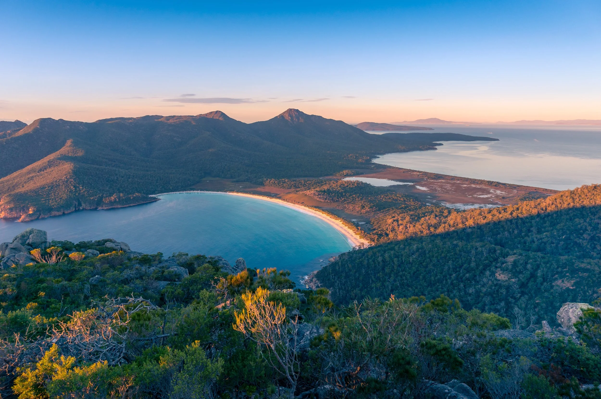 Wineglass Bay & Freycinet National Park (East Coast) — Known for its pink-granite mountains, turquoise seas, white-sand bays and the iconic curved cove of Wineglass Bay. Ideal for anchored nights, coastal hikes, or a quiet beach stroll.